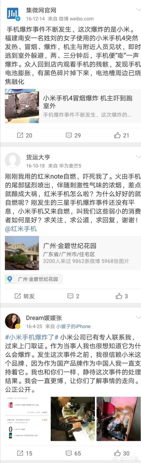 提问者说他在微博上看到这起事件,而且全凭口说,而我们却没有看到这起事件任何微博上的截屏信息,难道提问者空穴来风吗?不管提问者出于什么目的,但我还是在微博上热搜了一下,这一搜倒是搜出一大堆小米手机爆炸事件,我把这些微博上小米手机爆炸事件截屏下来分享给大家,让大家好好瞧瞧,由大家来评说。