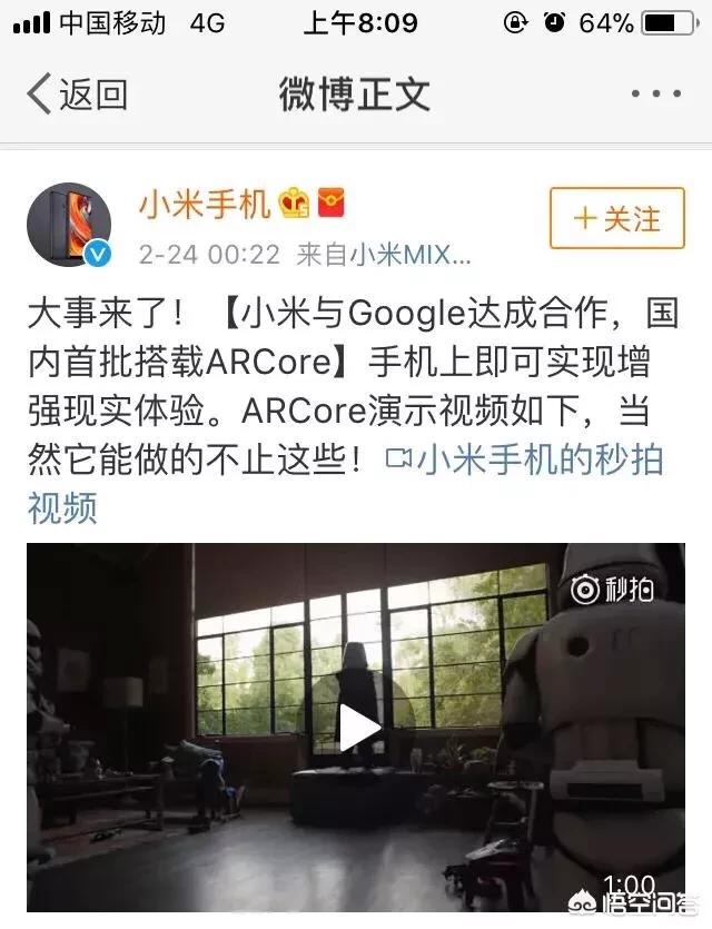 昨天晚上,小米官方微博故弄玄虚,宣称要在凌晨12点整公布“大事”。在迟到了22分钟后,小米正式宣布了所谓“大事”的具体内容:和谷歌合作,成为国内首批搭载谷歌ARcore功能的手机厂商之一,小米手机的用户可以率先获得ARCore的体验机会。