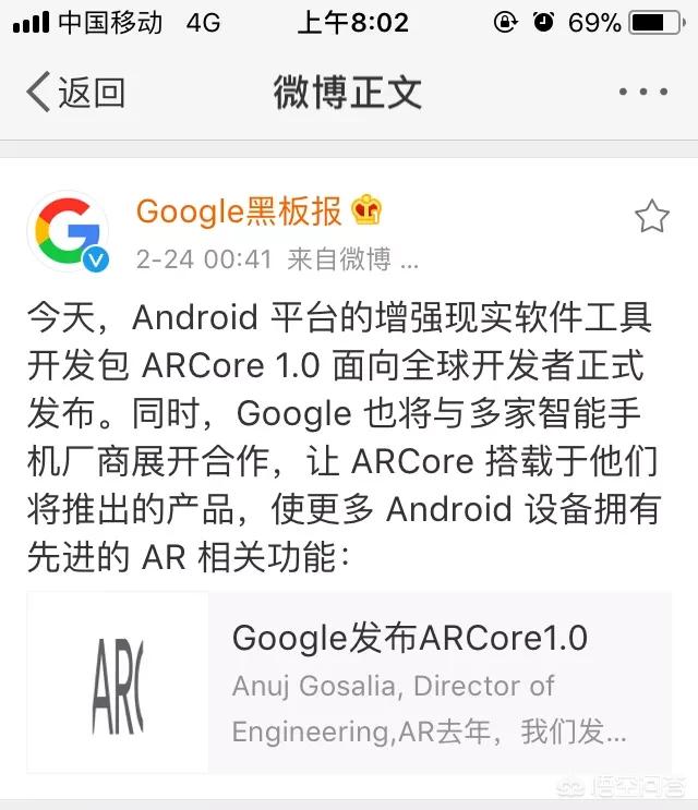 同一时间,谷歌黑板报也发微博称,今天,Android 平台的增强现实软件工具开发包 ARCore 1.0 面向全球开发者正式发布。