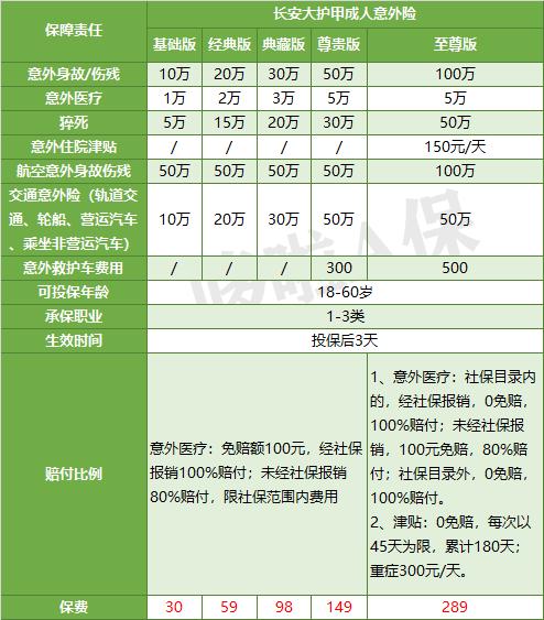 最低的基础版,一杯奶茶钱就保10万;最高的至尊版,价格也不贵,289元就能保100万,还能获得一份意外住院津贴。