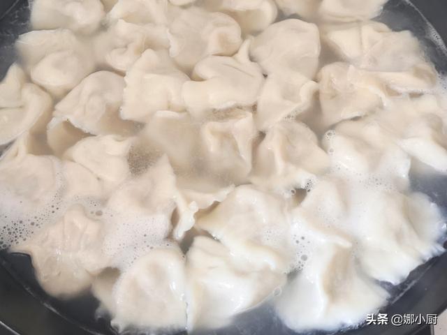 步骤 8、水开后,加入一小碗冷水,再次煮开至饺子飘起就已经煮好了,出锅装盘。