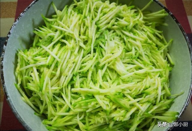 步骤 1、西葫芦插成丝,用半勺盐腌制十分钟,去水,攥干,尖椒切碎备用。