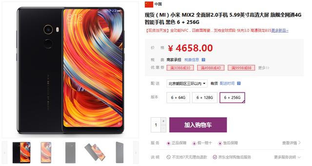 推荐三、小米 MIX2 全面屏2.0手机 5.99英寸高清大屏 旗舰全网通4G智能手机 黑色 6 + 256G
