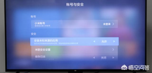 启动小米电视机进入主页的“小米电视设置”,找到”账号与安全“选项,将“安装未知来源应用”设置为允许;