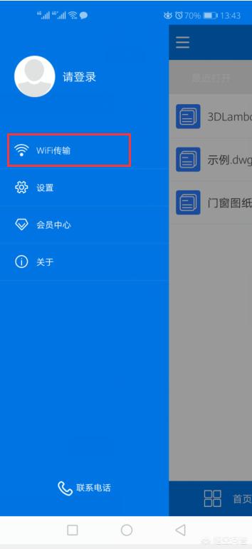 步骤二:将CAD看图安装完成之后,手指将右滑动一下,先点击“请登录”选项进行登录,之后在选择“WiFi传输”选项按钮。