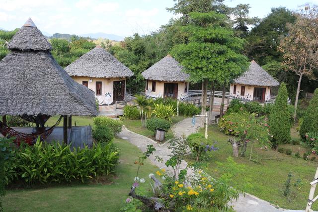 蓝天白云之下,群山环绕,延绵起伏,一株株高耸的热带树木绿幽幽的散落在山下的村庄中,一幢幢低矮的茅草屋掩映其中,远远望去,恍若走进隔世千年的世外桃源。