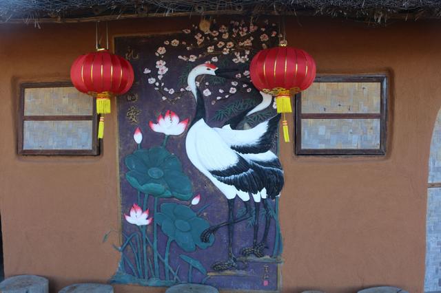 走进村中,溪流蜿蜒曲折,一幢幢低矮的茅草屋门前潺潺流过,渐行渐远,流进了村中不远处的一泓清澈的池塘,小溪边的茅草屋,土黄色的土坯墙,茅草覆盖的屋顶,窗户边的中国结,大门两边的对联,屋檐下那一盏盏大红的灯笼,俨然就是一个中国古村落的形象,土地平旷,屋舍俨然,有良田美池,阡陌交通,鸡犬相闻,活生生的世外桃源,中国式最美的古村落!