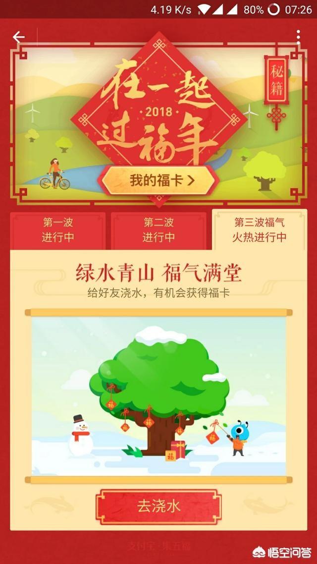 小编也是集齐了,就等着坐等2月15开奖呢,话说凭手气,最大666元,模式和去年一样,今年添加了养鸡下蛋的福卡,这里就不重点讲了,来说说今天刚刚开通的第三种玩法,通过给小伙伴蚂蚁森林浇水来获得福卡,每个人有一次浇水的福卡机会