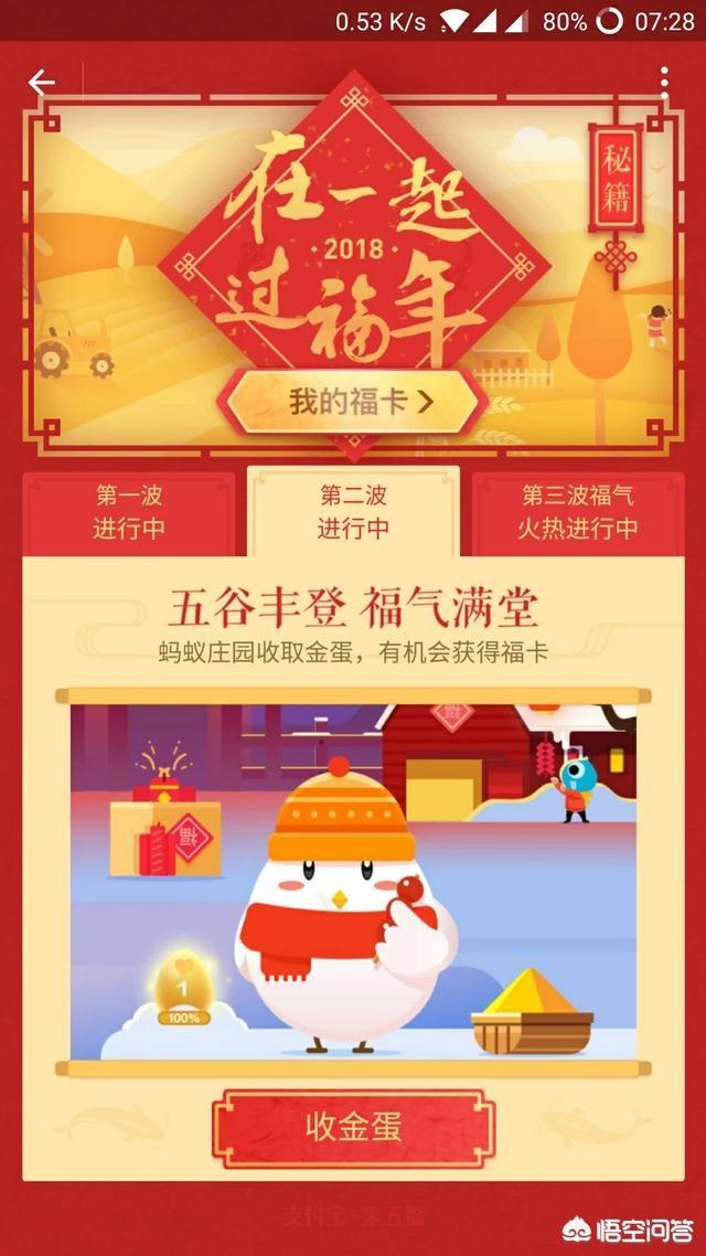 第二波:五谷丰登 福气满堂2月8日开始,每天可以在蚂蚁庄园里手机金蛋,就有可能得到福卡。