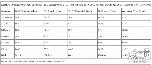 2017年,华为已经后来居上位居全球市场第三,前五大厂商的出货量和市场份额排名一致,分别为三星、苹果、华为、OPPO、小米,可喜的是中国产商占有前五中的三个席位。
