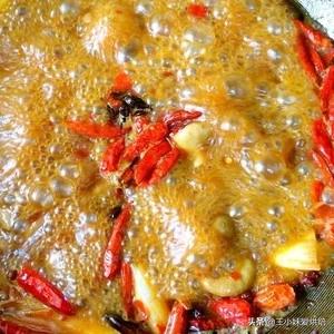 4、油锅烧热,先把泡椒、泡姜、干辣椒、花椒一起放入锅里煸炒;