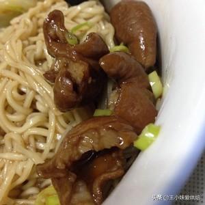 9、另起锅清水煮面后烫白菜叶一起捞入面碗,浇一大勺连汤带肥肠的浇头在面上。撒上葱花,开吃!