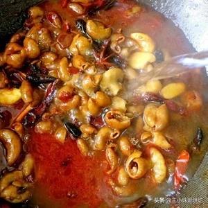 10、热锅、热油、依次下佐料、豆瓣酱、红烧酱油、肥肠