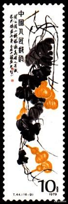 邮票1套16枚,套票发行量200万套,邮票志号T44,其中第九枚的画面就是齐白石的“葫芦”绘画作品。