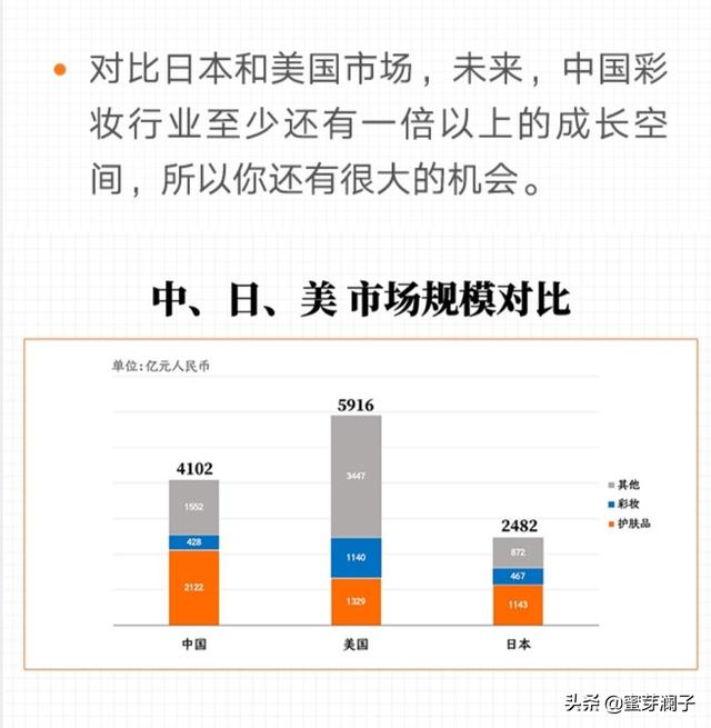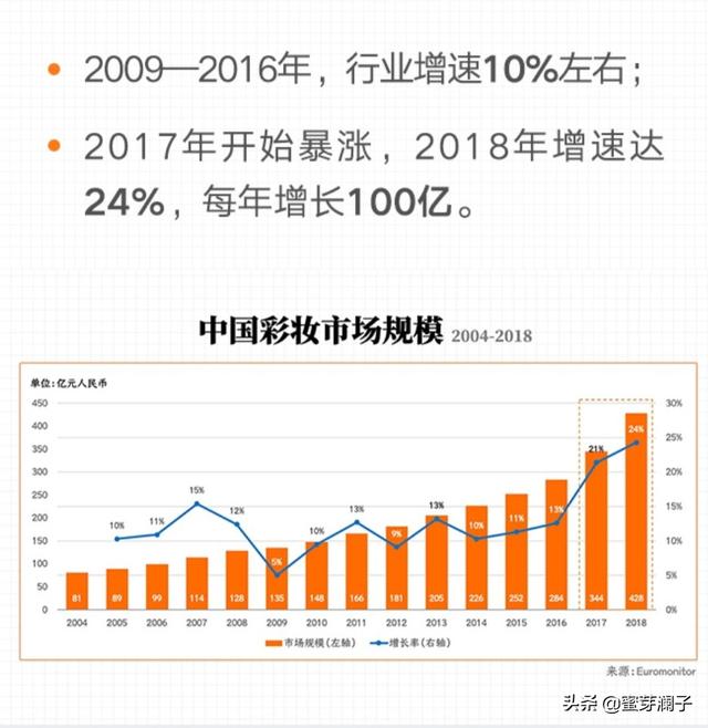 这段时间,正好在收集研究,这方面的资料。跟你说说,我的感受。从2016年到2018年,中国化妆品市场数据来看,化妆品市场增速惊人。特别是近两年,以每年100亿的速度增长。