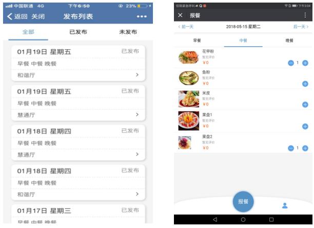 柏慧通微信云报餐平台可以实现菜品实时发布、一键报餐、就餐人员统计、菜品评价、人员菜品多维度分析动态\二维码签到。