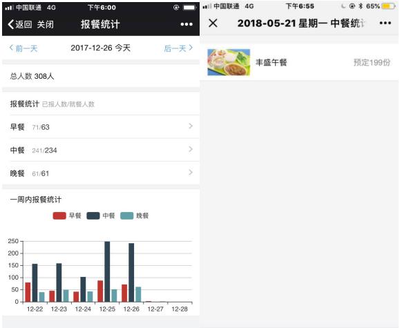 电脑端及微信端实时统计报餐人员及菜品,精准统计每天早、中、晚就餐的人数及报餐各菜品数量,指导食堂安排备餐。统计以往同期报餐及就餐情况,并一键导出统计报表,从而进行同期预测,杜绝浪费,同时方便食堂汇报,让预算决策有据可依。