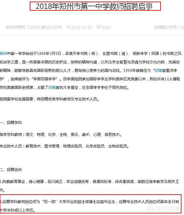 因为教师这个职业太好了,很多人都来抢,所以也水涨船高,比如郑州一中招聘,要求双一流大学的硕士或者博士。这毫无疑问,在河南只有郑州大学,河南大学有资格。
