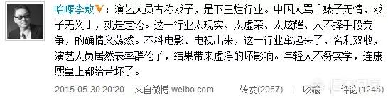 李敖写道:“演艺人员古称戏子,是下三烂行业。中国人骂‘婊子无情,戏子无义’,就是定论。这一行业太现实、太虚荣、太炫耀、太不择手段竞争,的确情义荡然。不料电影、电视出来,这一行业窜起来了,名利双收,演艺人员居然表率群伦了,结果带来虚浮的坏影响。年轻人不务实学,连康熙皇上都给带坏了。”
