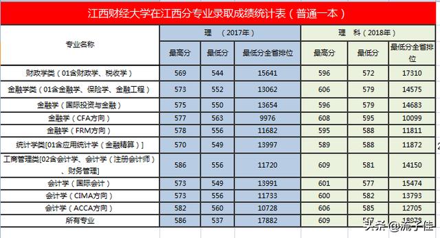先举个例子:图中数据是江西财经大学对江西理科生录取分数及排名(这是我为一位江西家长做的高考志愿规划院校分析表),江西财经大学属于财经类院校,是江西省第二高校,像金融、会计、统计学、经济学都非常火热,2017年在江西理科录取最低分是537分省排名17882名,2018年在江西理科录取最低分是567分省排名18978名,从排名看2018年排名比2017年排名高1000名以上!