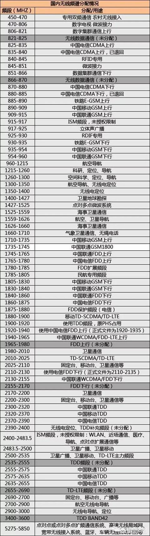 首先有国际电信联盟(ITU)会对将无线电各个频段进行划分给各个行业,然后再对各个行业的频段进行细分给全球各个国家和地区。(PS:所以为什么同样制式的4G网络去了国外就不能使用,因为各个国家地区使用的频段不一样,一般手机出厂会锁住非出售地的频段的。)同样的,我们国家也会在对国际电信联盟划给我们的各个无线电频段再进行细分给各个运营商。下面我将国内部分无线电使用的频段列出来给大家了解一下。