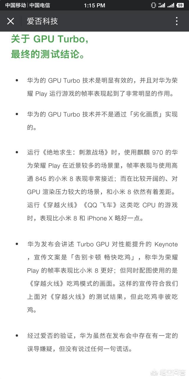 为GPU Turbo鼓掌 为GPU Turbo鼓掌 通过两款游戏的测试,我对荣耀这款Play的表现还是非常满意的,画质高+帧率流畅给我非常流畅的游戏体验。并且,它并不像其他采用高通845手机那样发热严重,GPU Turbo技术对手机控热方面的效果也非常明显。 其实,华为的GPU Turbo技术我们并不要从单一某一款产品来对它进行片面的认识,而它给我更多的是华为对未来手机游戏性能上的新解决方案。 华为 荣耀GPU Turbo图形处理加速技术华为 只要是使用GPU Turbo技术,未来硬件将不是限制游戏体验的瓶颈。即使是中端配置的机型,也能获得类似专业游戏手机的体验。