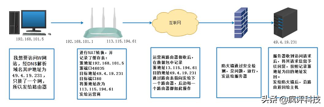 用户端192.168.101.5的主机准备打开W网站时,由DNS将其域名解析为IP地址49.4.19.231,于是产生一个源地址为192.168.101.5,目的地址为49.4.19.231的数据包,因为出口网关只有一个,就发往192.168.101.1的路由器,路由器对其进行NAT转换,将源地址192.168.101.5更改为自己wan口的公网IP 113.115.194.61,并记录了NAT缓存(源地址192.168.101.5,源端口46035,目的地址49.4.19.231,目的端口80),于是发往运营商的数据包中源地址为113.115.194.61,目的地址为49.4.19.231,之后互联网中间每一个路由器都会记录源地址和目的地址,用于寻找去往目的地的路,并提供要返回的地址,最后到达防火墙进行检测,安全后发给服务器收到后,完成一个单向访问;