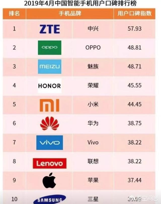 比如艾媒咨询5月发布的《2019年4月中国智能手机用户口碑排行榜》,中兴获得了57.93分,其用户口碑指数竟然高达第一,超过了手机用户心目中的巨头们。其排名如下:中兴、OPPO、魅族、荣耀、小米、华为、VIVO、联想、苹果、三星。从这份表单中可以看出,其口碑指数可能与我们固有的印象并不一样。