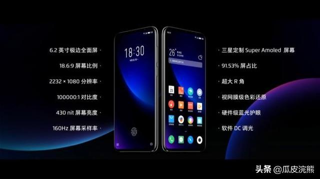 魅族16s Pro采用骁龙最新旗舰855 Plus处理器UFS3.0闪存。正面6.2英寸的三星AMOLED 1080P无刘海极边全面屏,160HZ采样率,屏占比91.53%