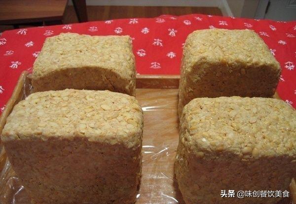 取一个小的方形保鲜盒,把豆碎放在里边压结实,倒扣出来就成了板砖的形状,也就是我们说的酱块,每个酱块大约一斤重,太小的酱块里面发酵出来的油比较少,吃起来不香。豆碎如果太干的话,不容易成形,可以放一些刚才锅里煮豆子的汤,但是不要太稀,否则做不成酱块。