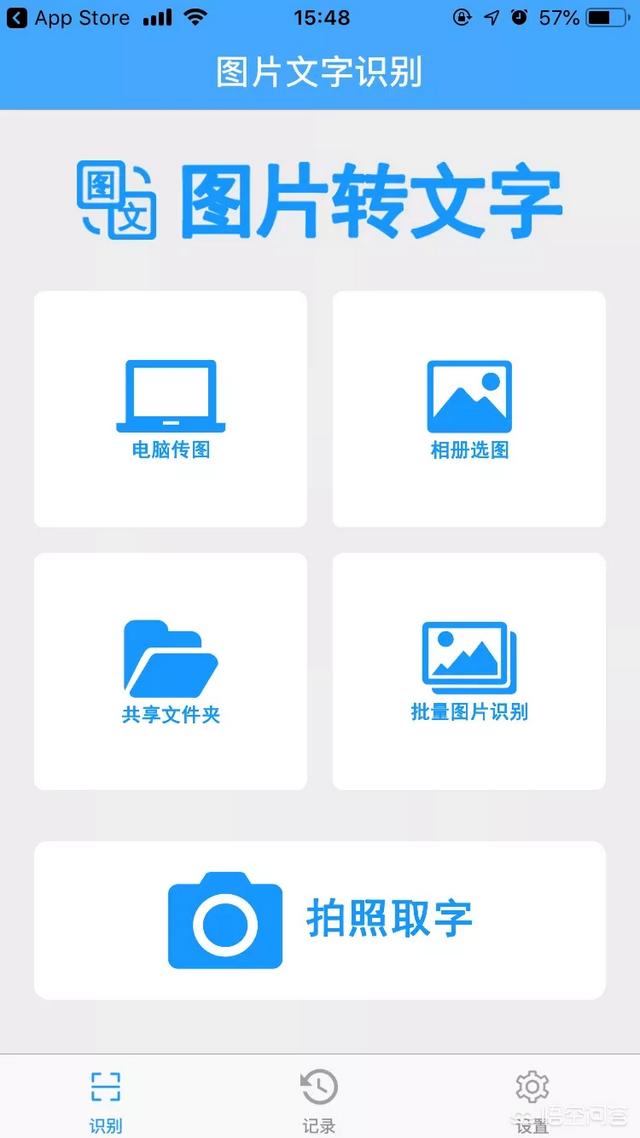 随便下载了一个蓝色的图片转文字APP,安装完成之后,打开主界面,功能一目了然: