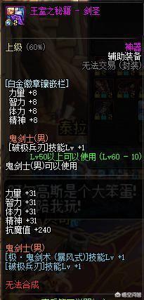 第三,拍卖行直接买带有白金徽章的辅助装备,这里推荐王室之秘籍-剑圣,带白金徽章的话直接2级破极兵刃,价格一般在2000w左右,不过剑魂如果有超大陆上衣(加两级破极兵刃)的话这个就省了,因为剑魂换装要秘技9或者Mr9,超大陆上衣和王室有一个就可以了。