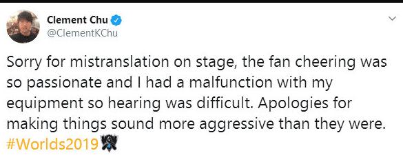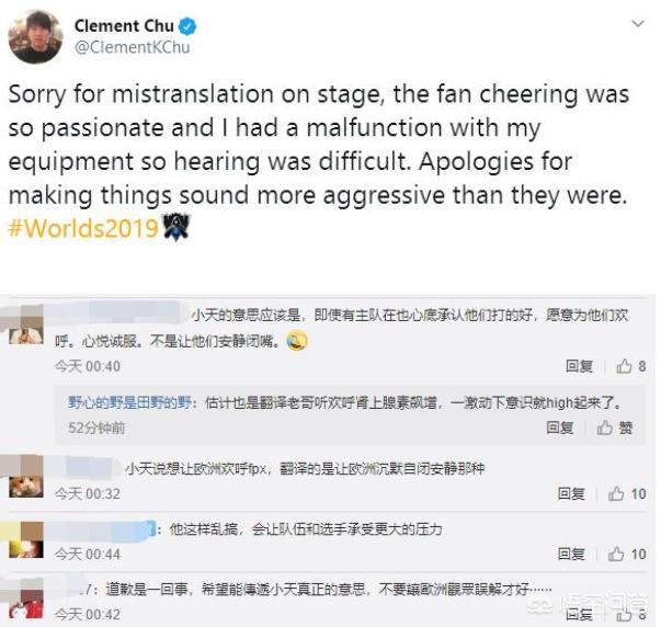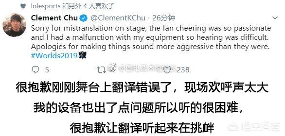 在赛后翻译小哥克莱门也是在推特上表达了自己的歉意,表示最后那句话翻译的有些问题,自己也没有很听清楚翻译的也不是很准确,感觉听起来像是在挑衅,对这个事情表示抱歉。