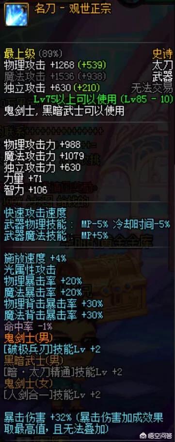 名刀属性: 高额暴击几率、32暴击伤害! 不缺暴击 、不缺爆伤!黄字可以混5次安图选手镯,称号白字 ,基础黄白爆齐全! 因为名刀属强没有优势!又为了以后可以出更好的武器。 所以最好的选择单件属性是一属强一独立!