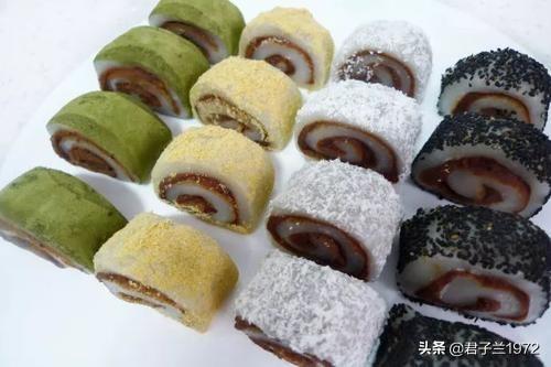 金灿灿的黄豆面,包裹糯米面饼,中间夹上不同馅料卷起而成,香甜可口,软糯劲道,豆香扑鼻,口感细腻。颜色有黄,白,红,等,充满食欲和诱惑,特别可爱。