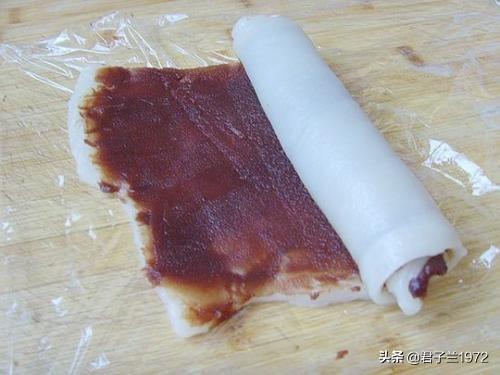 第五步,黄豆面适量平铺于面案板上,蒸好糯米饼不烫手即可,途上一层熟油,平铺于豆面上,用擀面杖擀成长方形薄饼,摊上馅,一定要均匀,撒上熟芝麻压平,从一端卷起,刀上刷油,切成小段即可。