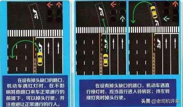 还有就是需要强调,如果有辅助说明标识的,通常为:“红灯亮时”、“左转绿灯亮时”,遇到这种标识,则要按照规定的红绿灯信号调头。而如果违反将按照闯红灯出发。对于无辅助说明标识(可以调头)的路口,不受红绿灯限制,但要确保安全。