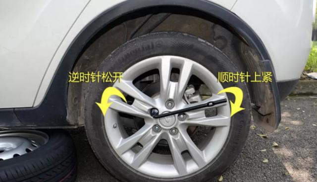 这里需要注意的是螺栓只要拧松一点就好,而不要拧掉,因为轮胎此时是和地面有接触的,比较好拧的,等会千斤顶抬起车来了,轮胎悬空了,再拧就不好发力了,轮胎会跟着一块转的。