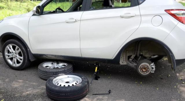在举升之前,把备胎塞在这个车子底下,这样万一发生意外,车子掉下来还能有个备胎垫着,能挡一下减小伤害。