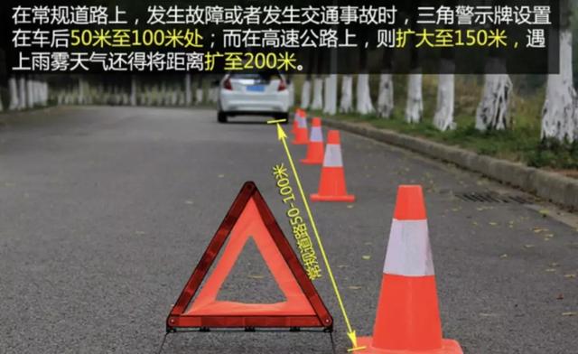 将警示三角牌摆到车后的安全距离内(非常重要),一般高速公路的话要在车后方150米距离摆放设置,也就是你走250步的距离,普通公路最低不少于50米,也就是你大概走80步的距离。