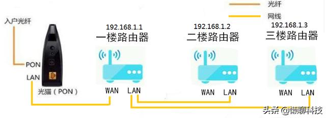 光猫LAN口与主路由WAN口连接,主路由的LAN口与二楼、三楼路由的LAN口连接,每台都要分别设置LAN口地址、相同的无线名称及密码、关闭DHCP服务,更改信道为1、6、11即可。