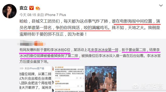袁立控诉马云的文章,笔者不敢苟同,但说道李冰冰,着实没想到。原来是有网友爆料:彭于晏与李冰冰抢c位。引起了袁立吐槽,一开始不知道袁立的立场,但后来更多的指向李冰冰。真是够乱,就是个坐位问题,都有很多内幕,何况是整个娱乐圈呢?