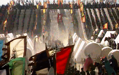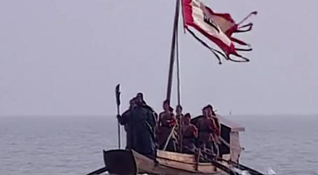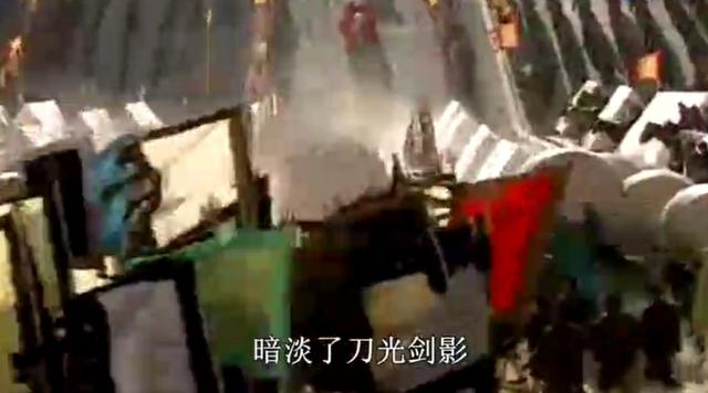 这是关羽单刀赴会,前往江东与东吴大都督鲁肃就荆州的借还问题进行谈判,关羽手执青龙偃月刀,立于船头,插曲响起,关羽那种弥天大勇,丹凤眼中斜睨出不屑的神气。非常符合关羽当时的心情和他的性格。