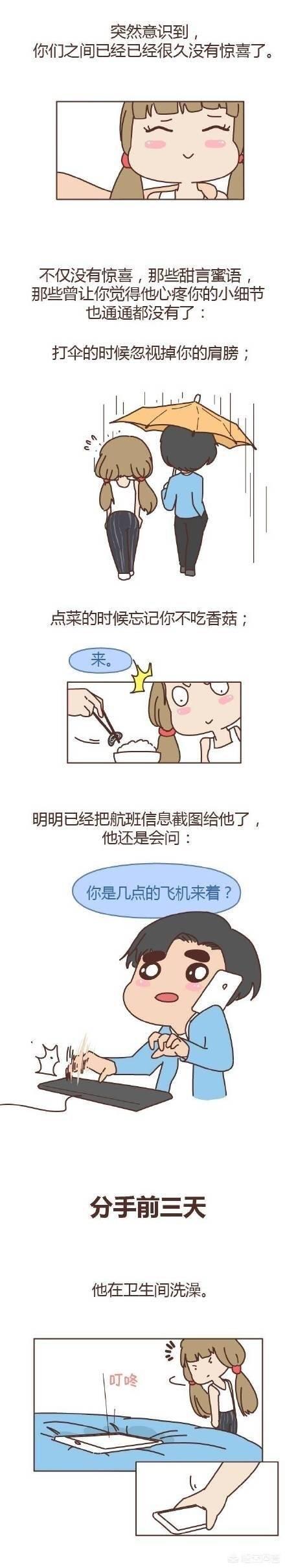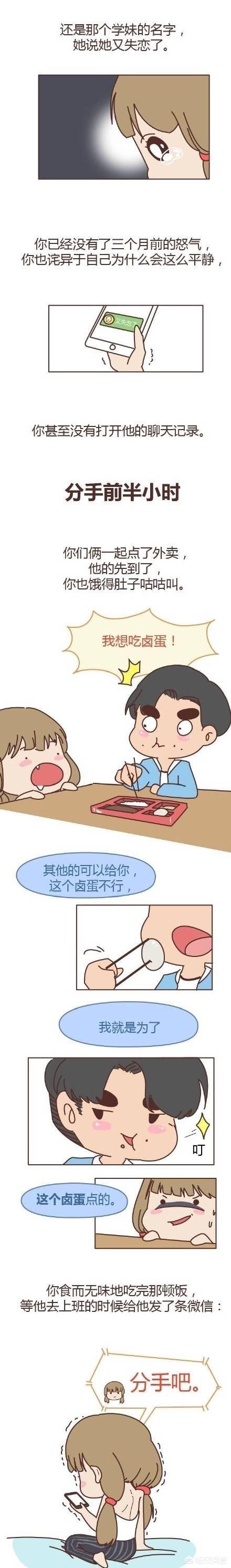 分手前半小时:你们俩一起点了外卖,你的到了,她肚子饿的咕咕叫。她说:想吃你碗里的卤蛋,你说:其他的都行,这个卤蛋不行,她食而无味的吃完了那顿饭,等你去上班的时候给你发了:分手吧。你想不明白为什么她要和我分手,难道仅仅因为一颗卤蛋。只有女生知道失望是一点一点积累的,很多事情不过是压死骆驼的最后一根稻草而已。