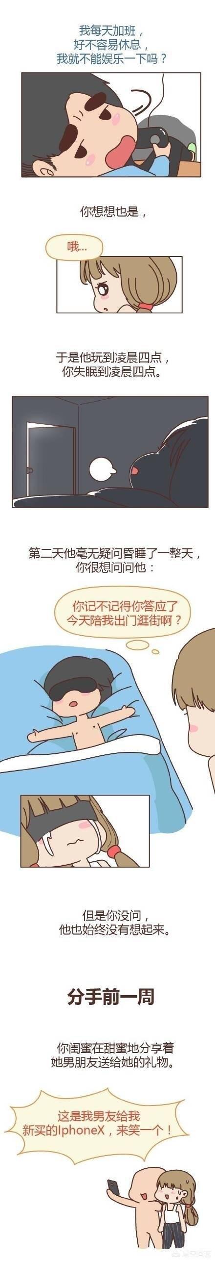 分手前一个月,那天是周六,她催促了好几遍等你陪她逛街。你说明天吧,她说好吧,明天别忘了,少玩会儿游戏,你说好不容易休息了,让我娱乐一下吧。她心想也是,于是你玩游戏玩到了凌晨两三点,毫无疑问第二天昏昏的睡了一天,她想问你:记得昨天答应我的什么事情吗?想了想没有说出口,你也没有想起来。
