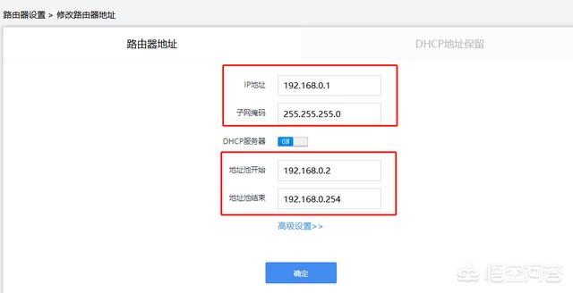 例如,WAN口的IP地址为192.168.1.0段,网关和DHCP服务器可以修改为192.168.0.0段地址。