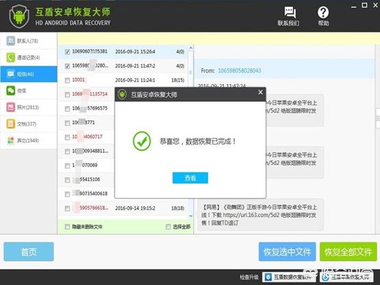 随后待软件扫描完成之后就可以在软件的界面上看到已经扫描出来的数据,这些数据都是可以恢复的,点击短信一栏可以看到扫描出来的短信,从这些短信中选择需要恢复的短信之后使用“恢复选中文件”将短信恢复。