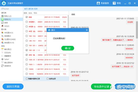软件扫描完成之后可以在软件的界面上看到已经扫描出来的数据了,从里面找到“短信”一栏点击进入之后找到需要恢复的短信之后点击勾选中,随后使用软件的“导出选中记录”对短信恢复。
