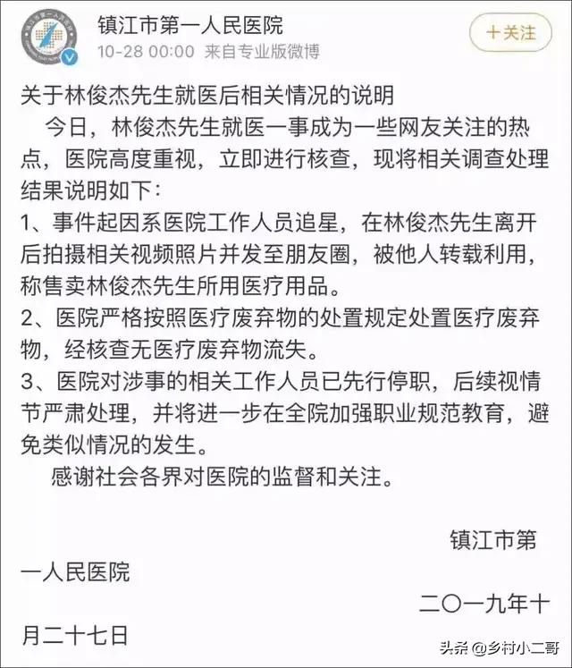 网传镇江市第一人民医院医护人员出售林俊杰吊水用过的针头,院方:无医疗废弃物流失,涉事人员追星被停职。你怎么看?