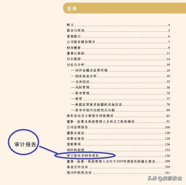 我们打开2019年度报告(A股),从目录可以看到上市公司年度报告内容非常丰富,有公司简介、财务摘要、公司治理报告、董事会报告、监事会报告、审计报告及财务报告等,显然审计报告包含在年度报告中,如下图: